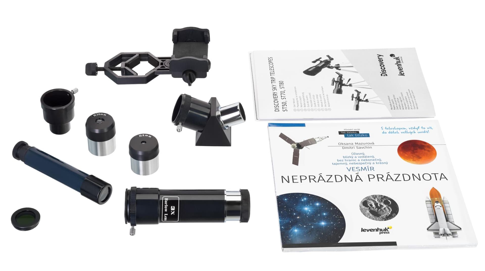 Il telescopio Levenhuk Discovery Sky Trip ST50 è venduto accompagnato da molti accessori e dal libro educativo "Spazio. Vuoto non-vuoto". I principianti potranno scoprire affascinanti informazioni sull’osservazione delle stelle e mettere subito in pratica le nozioni acquisite. Gli oculari di varie lunghezze focali e la lente di Barlow consentono di sperimentare con i fattori di ingrandimento, mentre il cercatore ottico permette di individuare correttamente degli oggetti specifici nella volta celeste. Il treppiede regolabile si adatta all’altezza dell’osservatore.