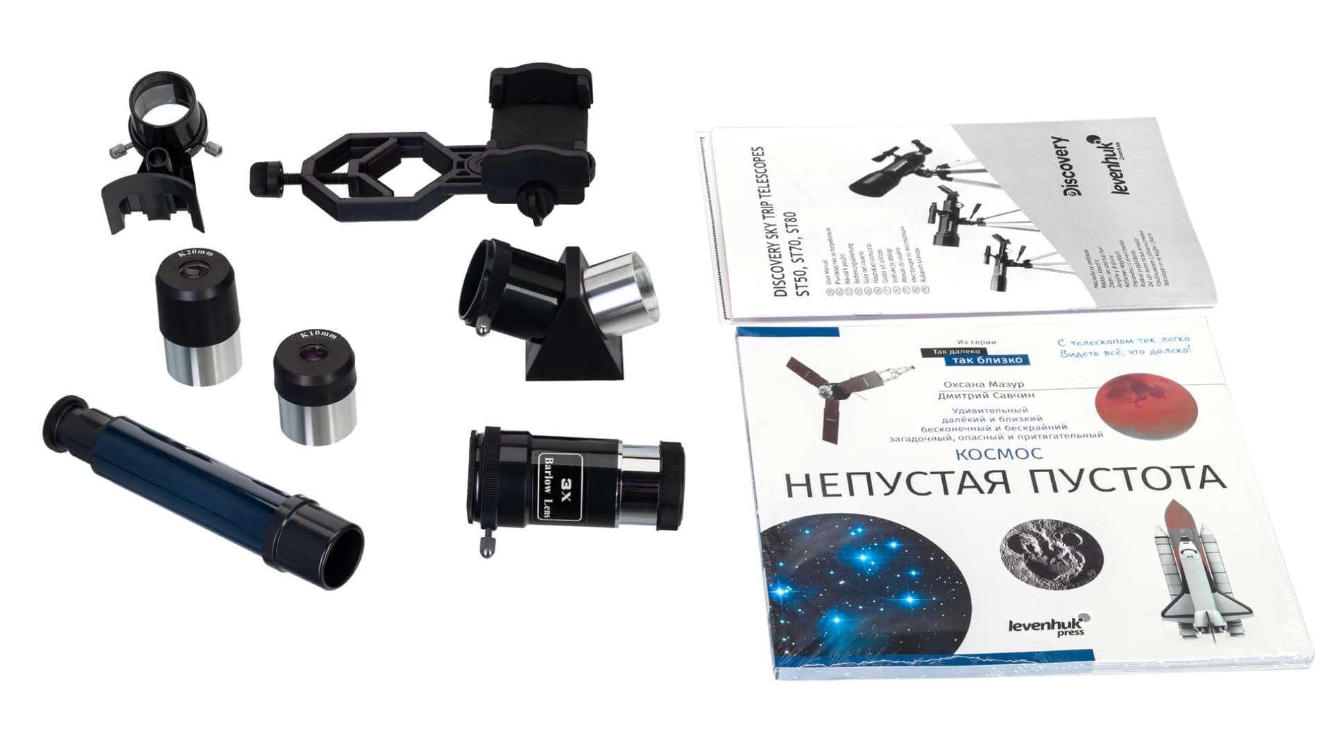 Il Levenhuk Discovery Sky Trip ST70 è facile da adoperare: il tubo ottico è installato su una montatura altazimutale che ne consente il movimento verso l’alto, il basso, verso destra e verso sinistra. Il telescopio è dotato di molti accessori: una lente di Barlow, oculari di diversa lunghezza focale, un cercatore ottico, un diagonale prismatico e un adattatore per smartphone. È possibile regolare l’ingrandimento per esplorare la bellezza dello spazio e scattare foto per catturare i risultati delle osservazioni. Un treppiede in alluminio ad altezza regolabile si adatta facilmente all’altezza di ogni utente.