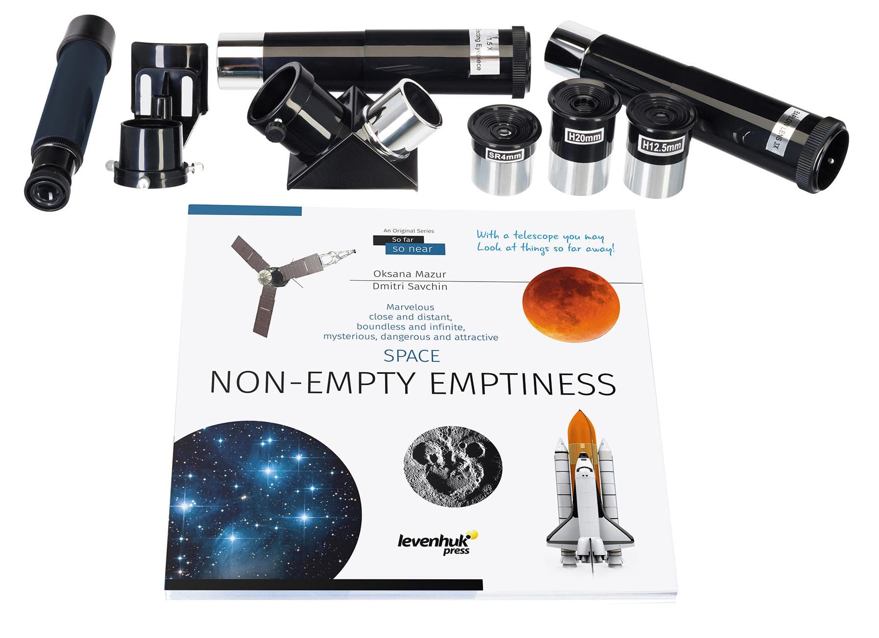 L’altezza del treppiede in alluminio è regolabile e il vassoio porta accessori consente di avere ogni accessorio utile a portata di mano. La confezione comprende tre oculari, ognuno con un diverso ingrandimento, un oculare raddrizzatore e una lente di Barlow da 3x. In aggiunta allo strumento e ai suoi accessori, è presente anche il libro educativo “Spazio. Vuoto non-vuoto”, il tutto in una confezione dai colori vivaci. Il libro offre delle descrizioni dettagliate dei corpi celesti del Sistema solare, di particolare interesse per i proprietari di un telescopio rifrattore, e fornisce anche consigli pratici su come affrontare le osservazioni al telescopio.